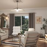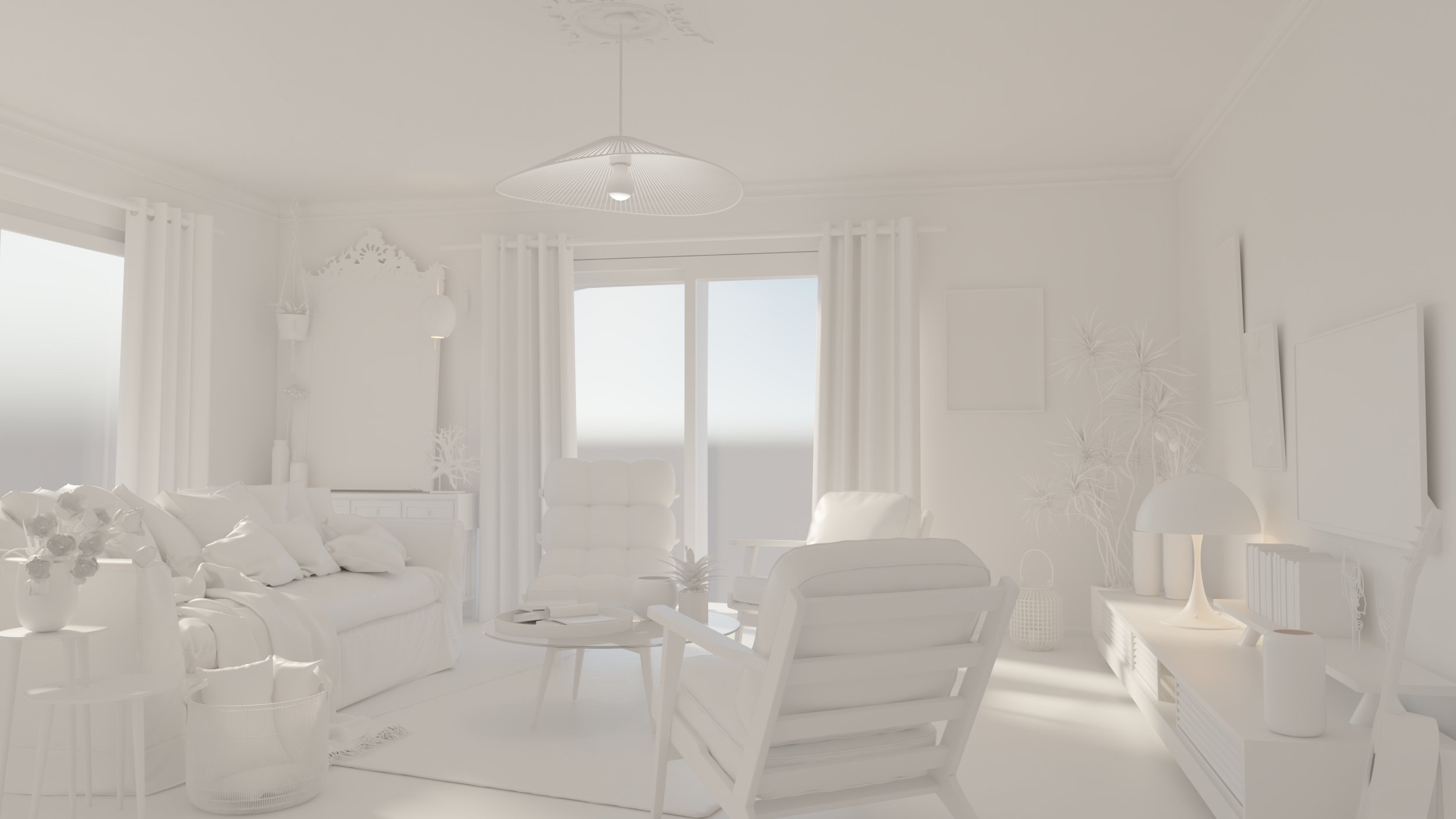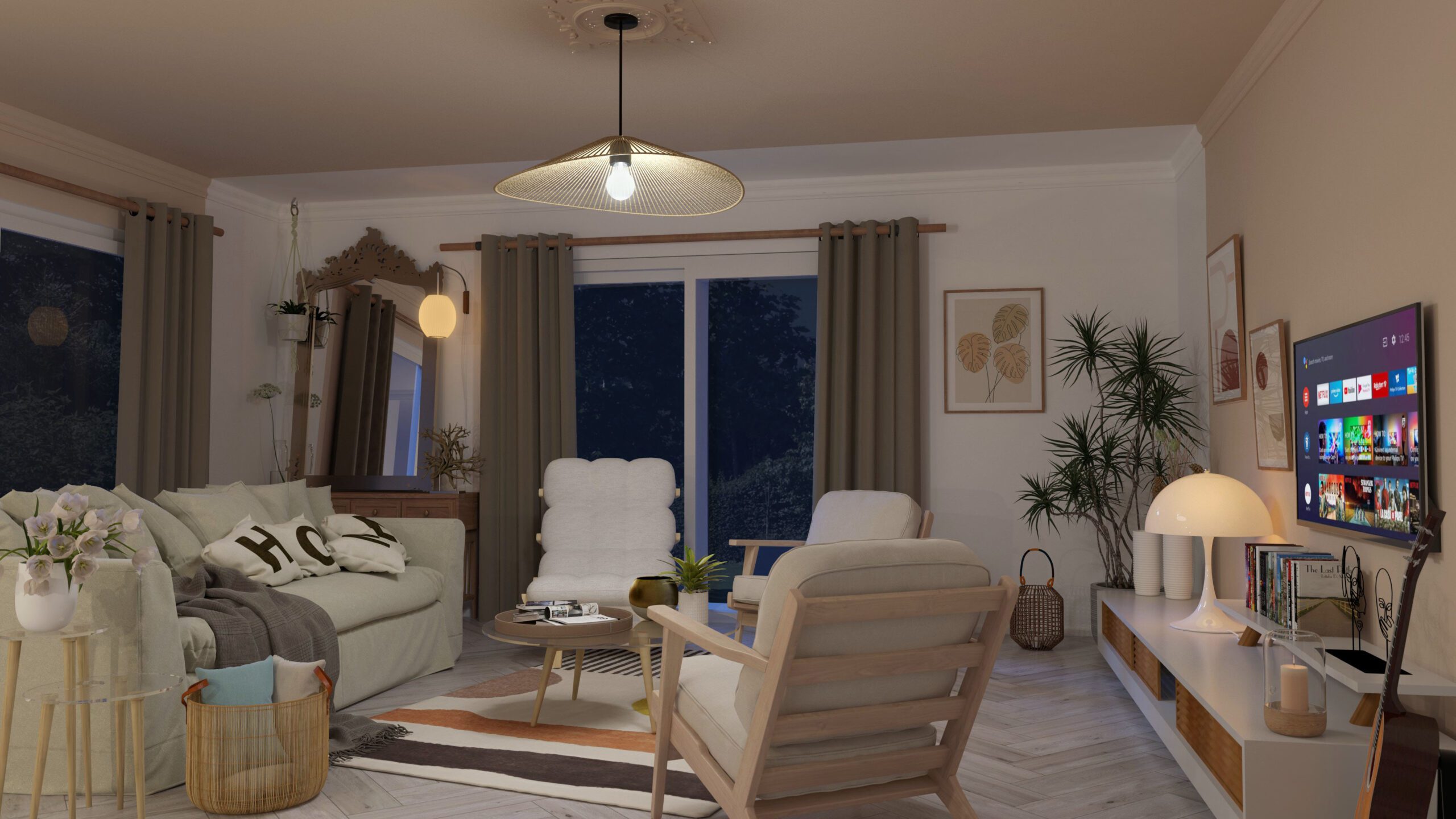 Salon CappuccinoJanvier 2023 Modélisation d’un salon sur base de plan. Rendu 360° Modélisation : SketchupTexturing/Rendu : V-Ray
